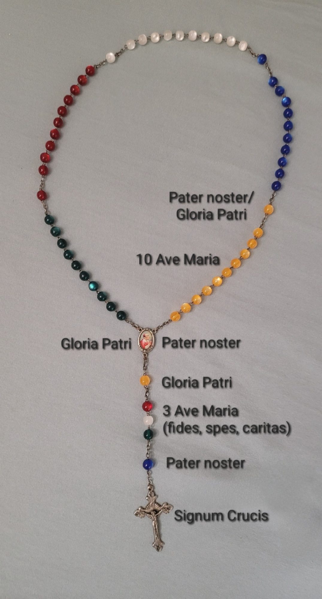 - 3 Ave Maria, je eines für die göttlichen Tugenden Glaube, Hoffnung und Liebe.